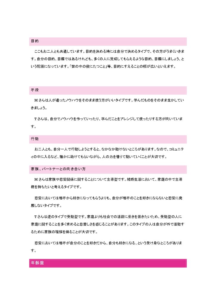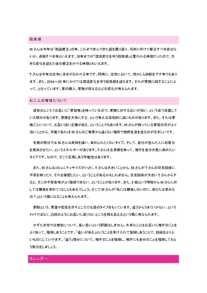 お二人の人生の設計図を導き出した上で、使命、資質も含めた複合的な視点から相性をお伝えします。相性の良い、悪い、という視点ではなく、お互いのことを深く理解するための鑑定となります。