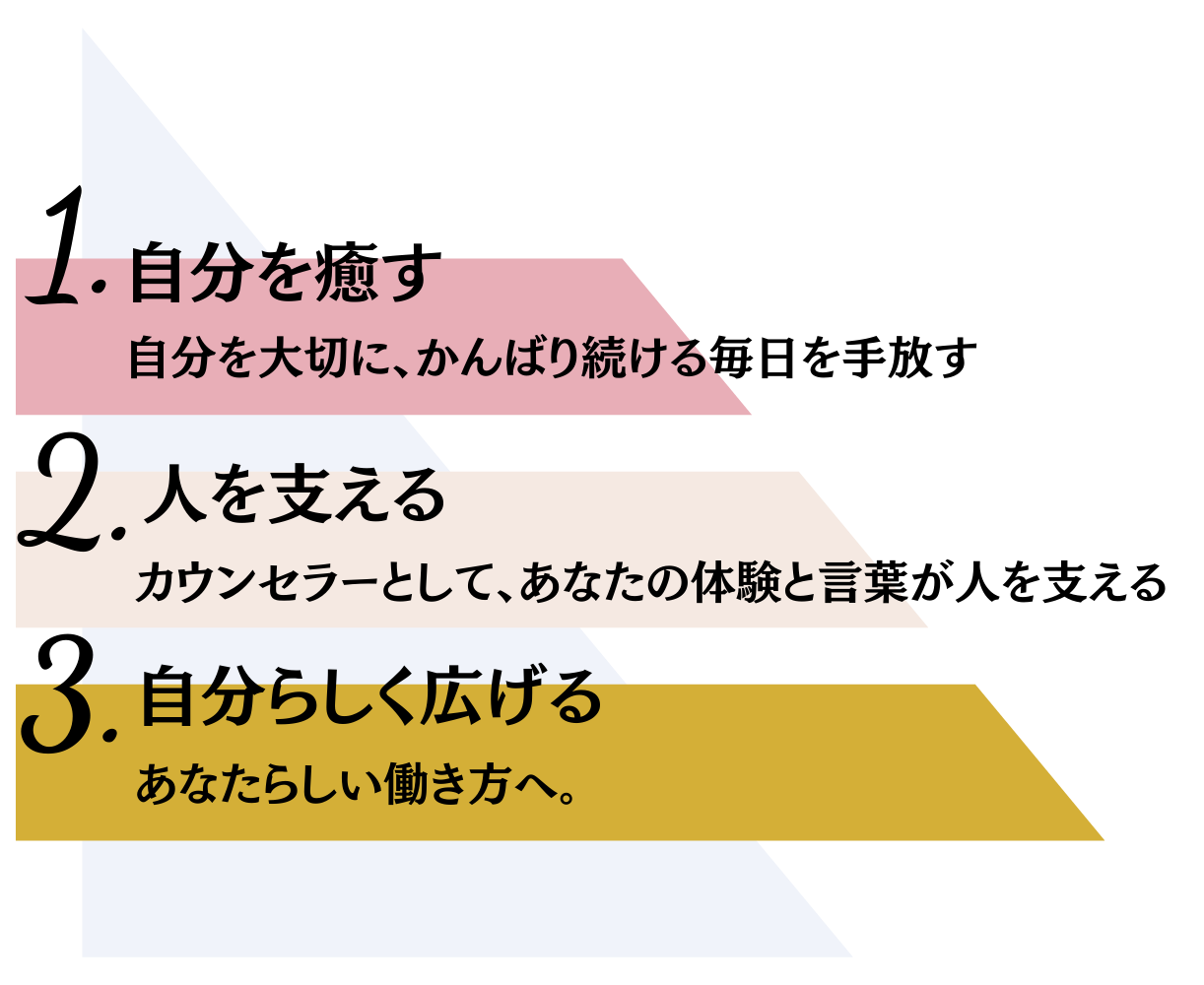 その悩みを癒しながら、自分が自分のカウンセラーとなって自己変容していくことで、やがては同じように悩んでいる人を支える力へと変わっていきます。